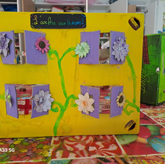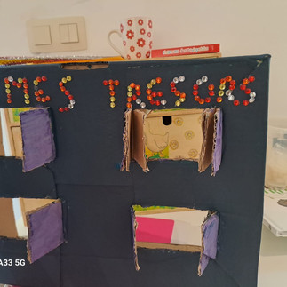 Grâce à la lecture de notre livre ... nous avons pu échanger, énumérer, verbaliser, puis concrétiser les trésors qui enrichissent nos vies (familles, amis, sports, passions, voisins, animaux, ...) C'est avec tous les trésors, tous ses trésors que les Artistes ont rempli et décoré leur maison.